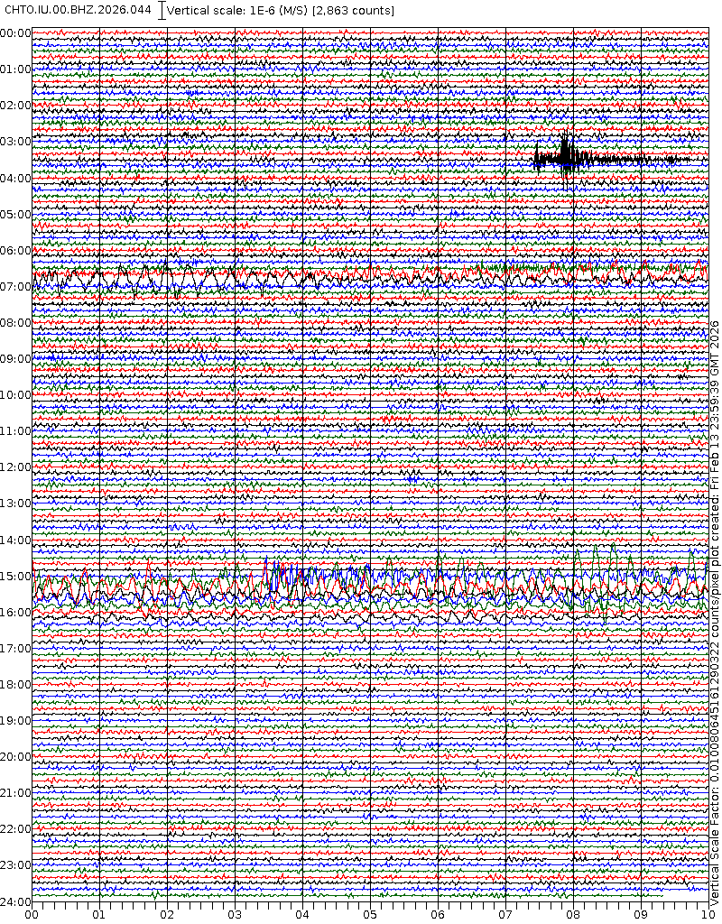 - 06:59 กราฟแผ่นดินไหวชนิดที่ใช้ดูเวลาเกิดเหตุเป็นหลัก แสดงภาพตามแนวตั้ง (BHZ) จากสถานีเครือข่าย IRIS สาขาเชียงใหม่ (CHTO) จาก 07:00 เช้าเมื่อวานนี้จนถึงเวลานี้ เส้นกราฟตามแนวนอนเส้นละ 10 นาที แยกสีเส้นกราฟเพื่อให้ดูได้ง่าย ช่องแบ่งตามแนวตั้งช่องละ 1 นาที
