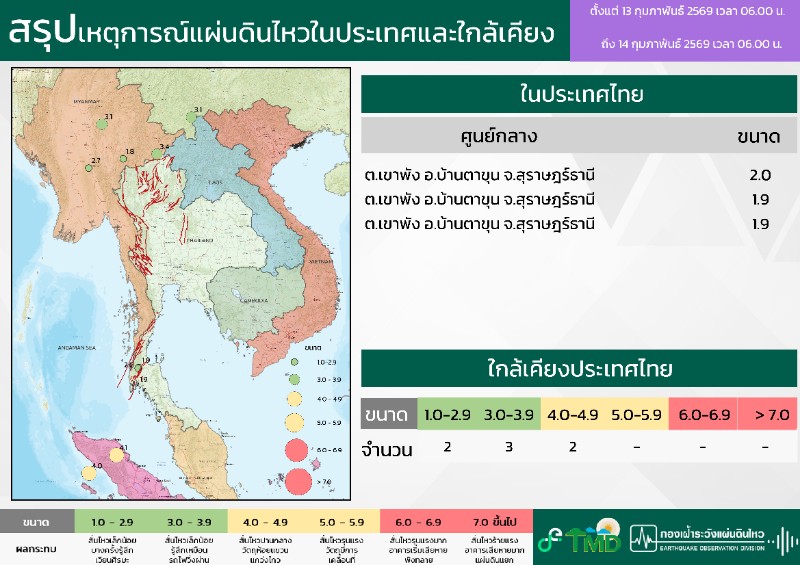 - 06:00 สรุปเหตุการณ์แผ่นดินไหวในประเทศไทยและเพื่อนบ้านตลอด 24 ชั่วโมงที่ผ่านมาที่ตรวจวัดได้โดยกรมอุตุฯ