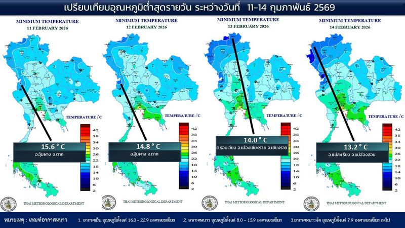 - 07:00 แผนที่เปรียบเทียบอุณหภูมิต่ำสุดในประเทศไทยรอบ 24 ชั่วโมงย้อนหลัง 4 วัน
