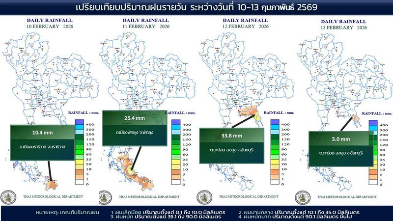 - 07:00 แผนที่เปรียบเทียบพื้นที่ที่มีปริมาณฝนสูงสุดในประเทศไทยรอบ 24 ชั่วโมงย้อนหลัง 4 วัน