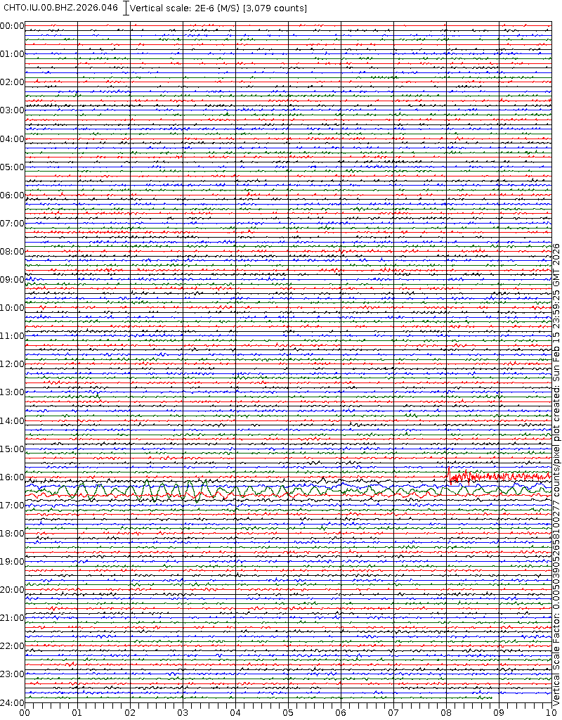 - 06:58 กราฟแผ่นดินไหวชนิดที่ใช้ดูเวลาเกิดเหตุเป็นหลัก แสดงภาพตามแนวตั้ง (BHZ) จากสถานีเครือข่าย IRIS สาขาเชียงใหม่ (CHTO) จาก 07:00 เช้าเมื่อวานนี้จนถึงเวลานี้ เส้นกราฟตามแนวนอนเส้นละ 10 นาที แยกสีเส้นกราฟเพื่อให้ดูได้ง่าย ช่องแบ่งตามแนวตั้งช่องละ 1 นาที