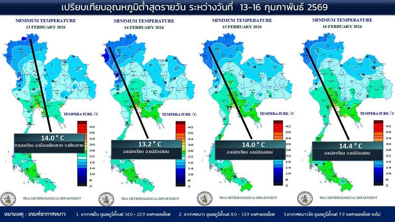 - 07:00 แผนที่เปรียบเทียบอุณหภูมิต่ำสุดในประเทศไทยรอบ 24 ชั่วโมงย้อนหลัง 4 วัน