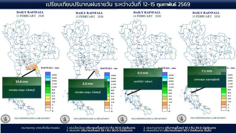- 07:00 แผนที่เปรียบเทียบพื้นที่ที่มีปริมาณฝนสูงสุดในประเทศไทยรอบ 24 ชั่วโมงย้อนหลัง 4 วัน
