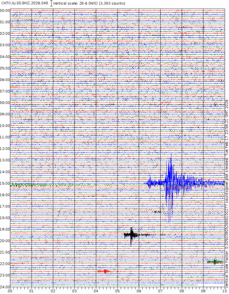 - 06:58 กราฟแผ่นดินไหวชนิดที่ใช้ดูเวลาเกิดเหตุเป็นหลัก แสดงภาพตามแนวตั้ง (BHZ) จากสถานีเครือข่าย IRIS สาขาเชียงใหม่ (CHTO) จาก 07:00 เช้าเมื่อวานนี้จนถึงเวลานี้ เส้นกราฟตามแนวนอนเส้นละ 10 นาที แยกสีเส้นกราฟเพื่อให้ดูได้ง่าย ช่องแบ่งตามแนวตั้งช่องละ 1 นาที