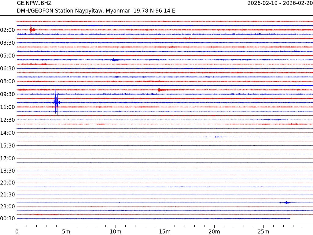- 07:57 กราฟแผ่นดินไหว ช่วง 24 ชั่วโมงที่ผ่านมา บันทึกจากสถานีกรุงเนปิดอว์ ประเทศพม่า (กราฟนี้เน้นใช้ประโยชน์เรื่องของเวลาที่เกิดแผ่นดินไหว โดยแยกสีเป็นแดงน้ำเงินสีละครึ่งชั่วโมงเพื่อให้ดูง่าย ส่วนเรื่องขนาดแผ่นดินไหว กราฟนี้ไม่อาจใช้ระบุตัวเลขที่ชัดเจน)