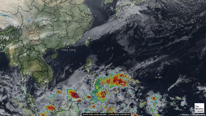 - 07:00 ภาพดาวเทียมย้อมสีจาก TWC แสดงกลุ่มฝนในเอเชียตะวันออกเฉียงใต้และโซนตะวันตกของมหาสมุทรแปซิฟิกเวลานี้