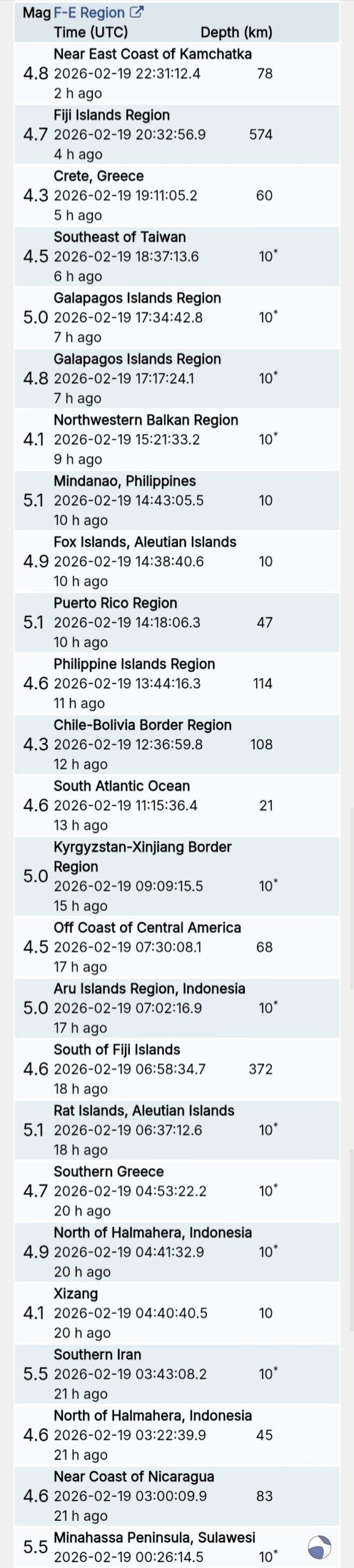 สรุปรายการแผ่นดินไหวและอาฟเตอร์ช็อกทั่วโลกจาก Geofon เยอรมนี ช่วง 07:00 เมื่อวานนี้ ถึง 07:00 เช้าวันนี้ (เวลาในตารางเป็น UTC ต้องบวก 7 ชั่วโมงให้เป็นเวลาไทย)