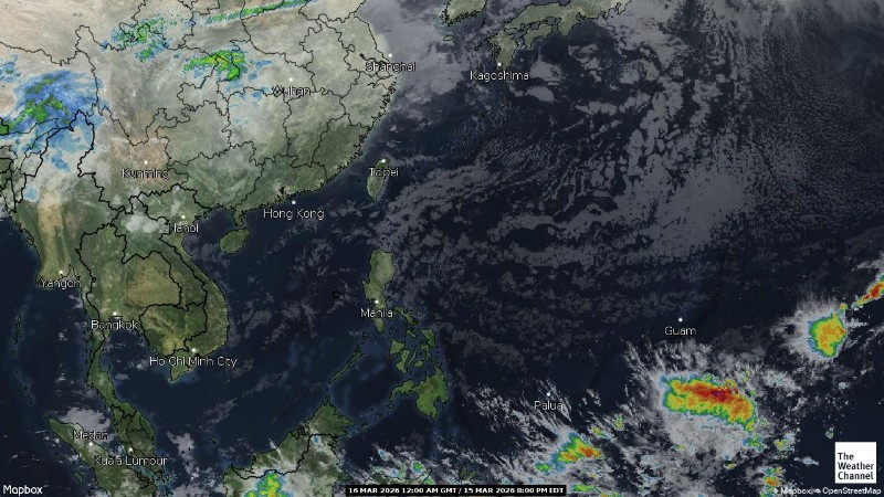 - 07:00 ภาพดาวเทียมย้อมสีจาก TWC แสดงกลุ่มฝนในเอเชียตะวันออกเฉียงใต้และโซนตะวันตกของมหาสมุทรแปซิฟิกเวลานี้