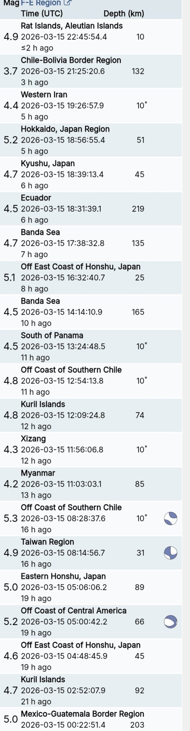 สรุปรายการแผ่นดินไหวและอาฟเตอร์ช็อกทั่วโลกจาก Geofon เยอรมนี ช่วง 07:00 เมื่อวานนี้ ถึง 07:00 เช้าวันนี้ (เวลาในตารางเป็น UTC ต้องบวก 7 ชั่วโมงให้เป็นเวลาไทย)