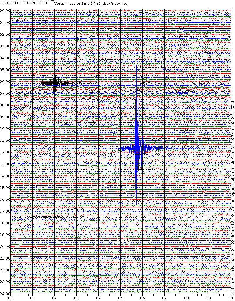 • 06:59 กราฟแผ่นดินไหวชนิดที่ใช้ดูเวลาเกิดเหตุเป็นหลัก แสดงภาพตามแนวตั้ง (BHZ) จากสถานีเครือข่าย IRIS สาขาเชียงใหม่ (CHTO) จาก 07:00 เช้าเมื่อวานนี้จนถึงเวลานี้ เส้นกราฟตามแนวนอนเส้นละ 10 นาที แยกสีเส้นกราฟเพื่อให้ดูได้ง่าย ช่องแบ่งตามแนวตั้งช่องละ 1 นาที