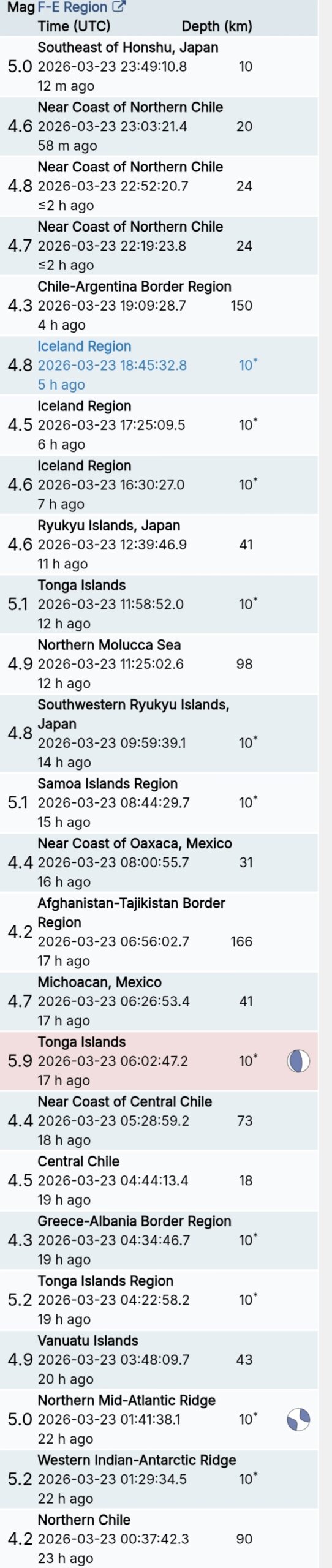 สรุปรายการแผ่นดินไหวและอาฟเตอร์ช็อกทั่วโลกจาก Geofon เยอรมนี ช่วง 07:00 เมื่อวานนี้ ถึง 07:00 เช้าวันนี้ (เวลาในตารางเป็น UTC ต้องบวก 7 ชั่วโมงให้เป็นเวลาไทย)