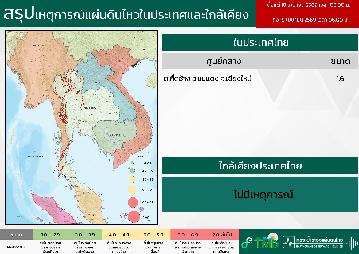 - 06:00 สรุปเหตุการณ์แผ่นดินไหวในประเทศไทยและเพื่อนบ้านตลอด 24 ชั่วโมงที่ผ่านมาที่ตรวจวัดได้โดยกรมอุตุฯ