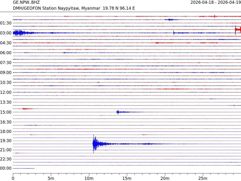 - 07:02 กราฟแผ่นดินไหว ช่วง 24 ชั่วโมงที่ผ่านมา บันทึกจากสถานีกรุงเนปิดอว์ ประเทศพม่า (กราฟนี้เน้นใช้ประโยชน์เรื่องของเวลาที่เกิดแผ่นดินไหว โดยแยกสีเป็นแดงน้ำเงินสีละครึ่งชั่วโมงเพื่อให้ดูง่าย ส่วนเรื่องขนาดแผ่นดินไหว กราฟนี้ไม่อาจใช้ระบุตัวเลขที่ชัดเจน)