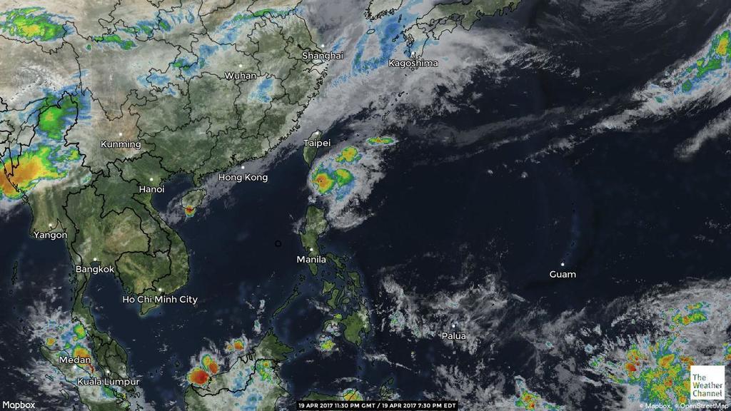 - 06:30 ภาพดาวเทียมจาก TWC แสดงตำแหน่งหย่อมความกดอากาศต่ำ 02W ซึ่งทาง WMO ถือว่าสลายตัวแล้ว แต่ทาง JMA ยังให้ค่าเป็นพายุเปรสชัน กำลังเคลื่อนตัวเข้าใกล้ทางใต้ของไต้หวัน