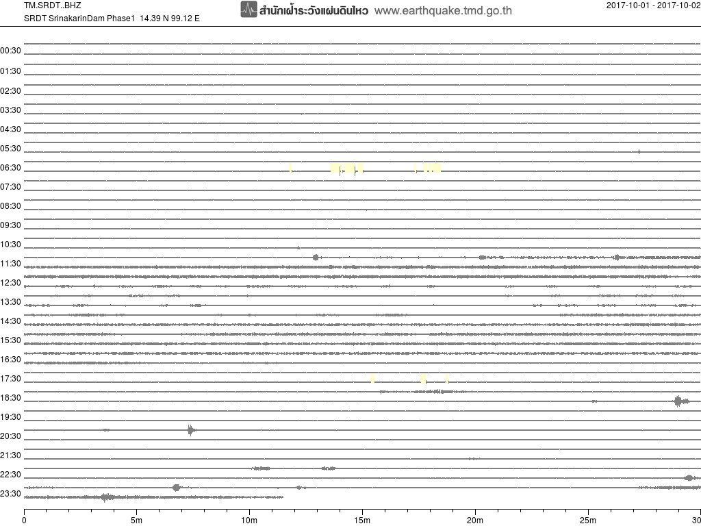 - กราฟแผ่นดินไหวจากสถานี สถานี SRDT เขื่อนศรีนครินทร์ ของสำนักเฝ้าระวังฯ กรมอุตุฯ จากเวลา 07:00 เมื่อวานนี้ถึง 07:00 เช้านี้