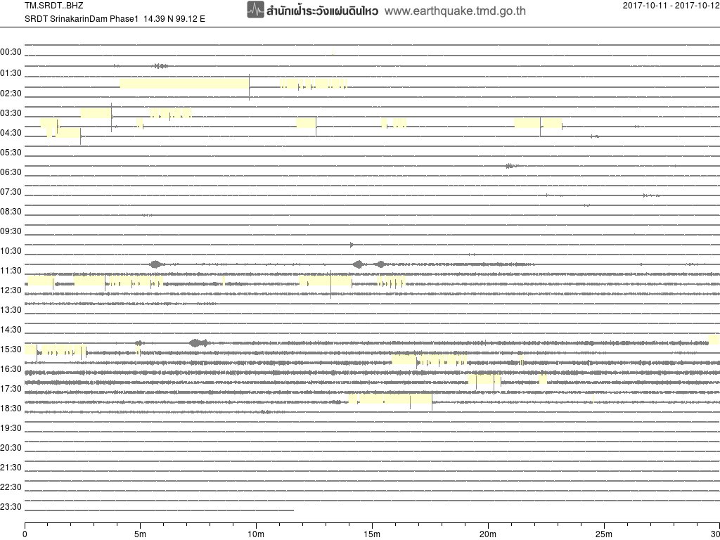 - กราฟแผ่นดินไหวจากสถานี สถานี SRDT เขื่อนศรีนครินทร์ ของสำนักเฝ้าระวังฯ กรมอุตุฯ จากเวลา 07:00 เมื่อวานนี้ถึง 07:00 เช้านี้