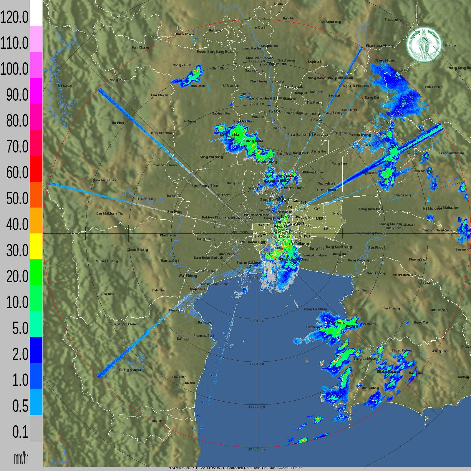- 00:10 เรดาร์จาก TMD แสดงให้เห็นกลุ่มฝนจากตะวันตกเฉียงเหนือและตะวันออกเฉียงใต้ เคลื่อนเข้ามาชนกันกลางกรุง ฝนตกหนักมากในหลายพื้นที่