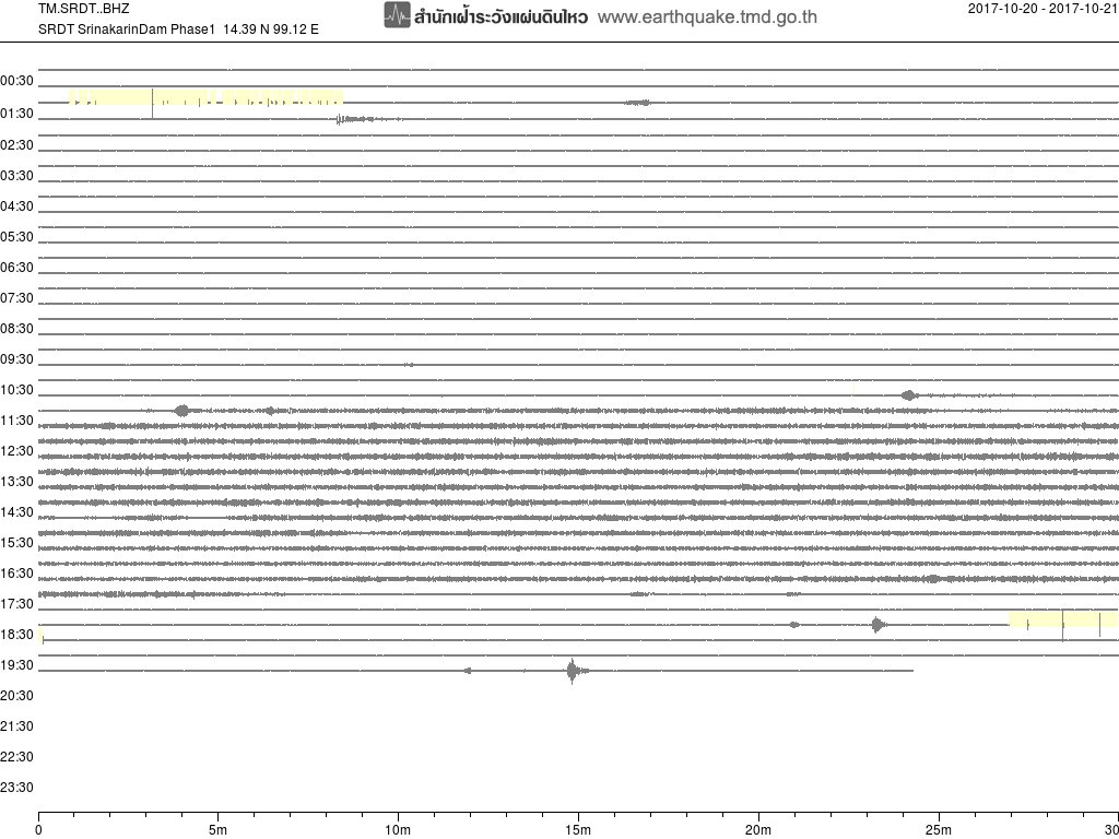 - กราฟแผ่นดินไหวจากสถานี สถานี SRDT เขื่อนศรีนครินทร์ ของสำนักเฝ้าระวังฯ กรมอุตุฯ จากเวลา 07:00 เมื่อวานนี้ถึง 07:00 เช้านี้
