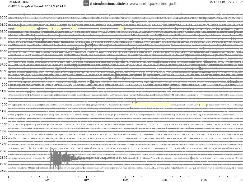 - กราฟแผ่นดินไหวจากสถานี สถานี CMMT เชียงใหม่ ของสำนักเฝ้าระวังฯ กรมอุตุฯ จากเวลา 07:00 เมื่อวานนี้ถึง 07:00 เช้านี้
