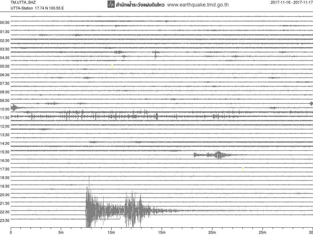 - กราฟแผ่นดินไหวจากสถานี เขื่อนสิริกิติ์ จ.อุตรดิตถ์ UTTA ของสำนักเฝ้าระวังฯ กรมอุตุฯ จากเวลา 07:00 เมื่อวานนี้ถึง 07:00 เช้านี้