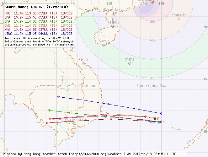 - 19:00 ศูนย์กลางพายุโซนร้อน คีโรกี อยู่ที่พิกัด 11.6°N 111.9°E ในทะเลจีนใต้ ความกดอากาศ 1000 hPa ความเร็วลมใกล้ศูนย์กลางพายุ 35 น็อต คาดว่า จะขึ้นฝั่งเวียดนามพรุ่งนี้ (19 พ.ย.)