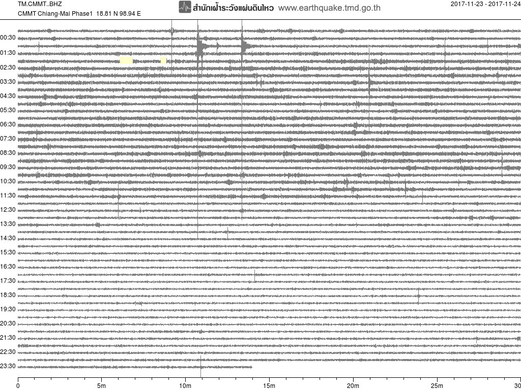 - กราฟแผ่นดินไหวจากสถานี สถานี เชียงใหม่ CMMT ของสำนักเฝ้าระวังฯ กรมอุตุฯ จากเวลา 07:00 เมื่อวานนี้ถึง 07:00 เช้านี้