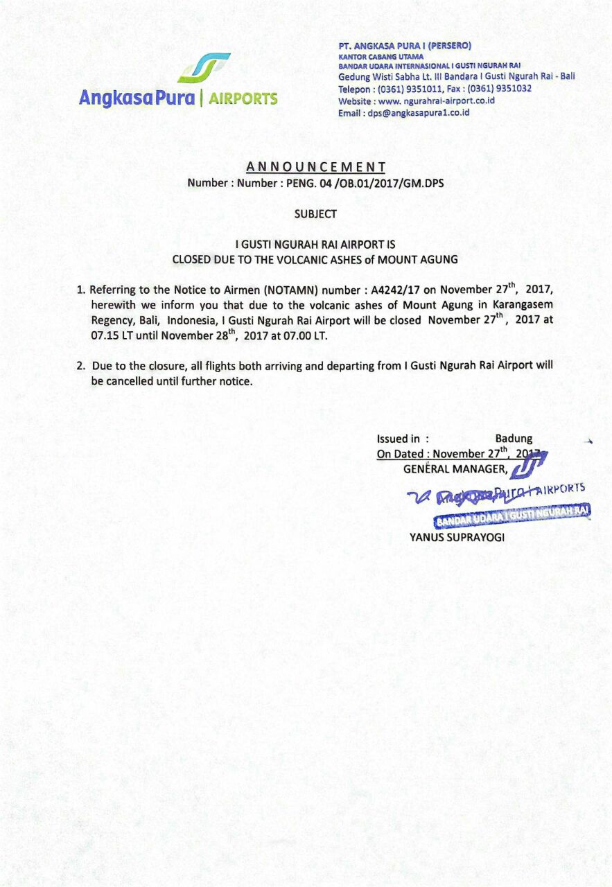- 09:00 จากปฎิกิริยาของภูเขาไฟอากุง ทางการบาหลี สั่งปิดสนามบิน Ngurah rai หรือ Denpasar ทางใต้ของเกาะ จากวันนี้ ถีง 07:00 เช้าวันพรุ่งนี้ (28 พ.ย.)
