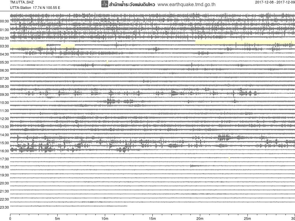 - กราฟแผ่นดินไหวจากสถานี เขื่อนสิริกิติ์ จ.อุตรดิตถ์ UTTA ของสำนักเฝ้าระวังฯ กรมอุตุฯ จากเวลา 07:00 เมื่อวานนี้ถึง 07:00 เช้านี้