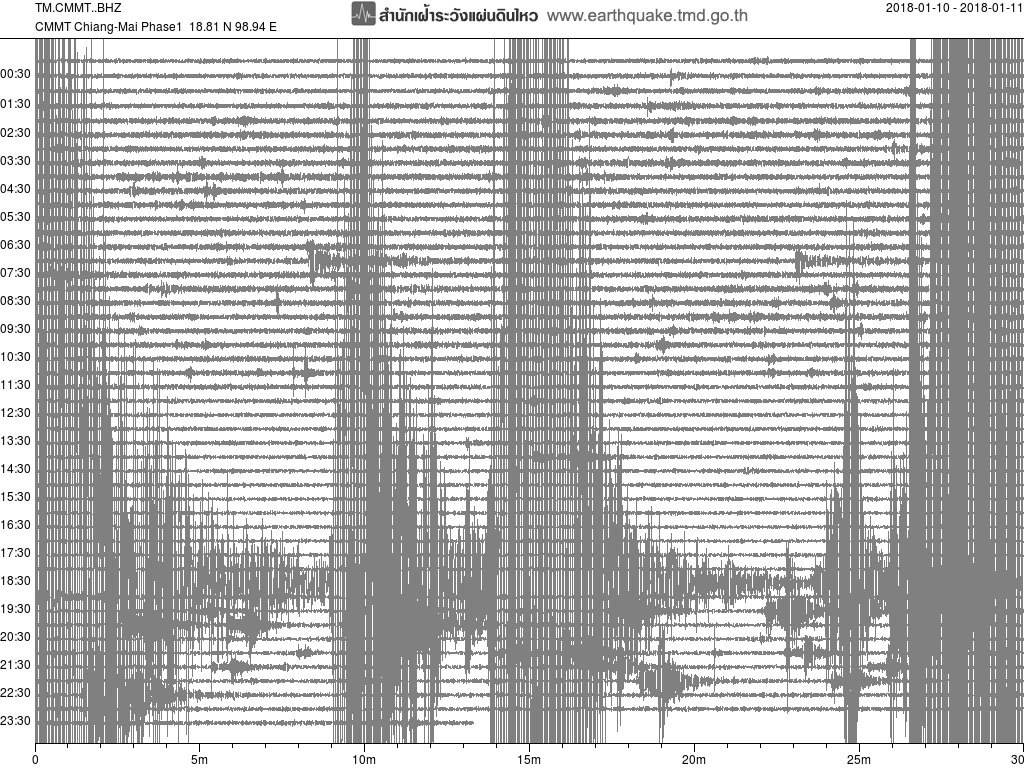 - กราฟแผ่นดินไหวจากสถานี สถานี CMMT เชียงใหม่ ของสำนักเฝ้าระวังฯ กรมอุตุฯ จากเวลา 07:00 เมื่อวานนี้ถึง 07:00 เช้านี้
