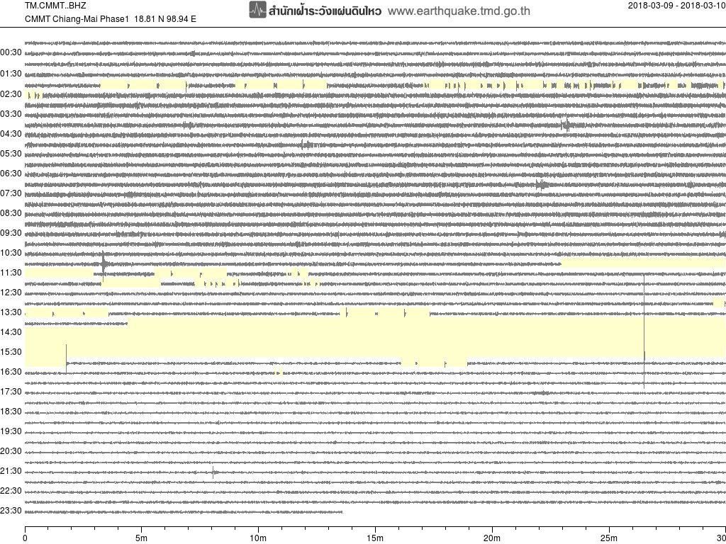 - กราฟแผ่นดินไหวจากสถานี CMMT เชียงใหม่ ของสำนักเฝ้าระวังฯ กรมอุตุฯ จากเวลา 07:00 เมื่อวานนี้ถึง 07:00 เช้านี้