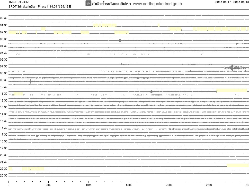 - กราฟแผ่นดินไหวจากสถานี SRDT เขื่อนศรีนครินทร์ ของสำนักเฝ้าระวังฯ กรมอุตุฯ จากเวลา 07:00 เมื่อวานนี้ถึง 07:00 เช้านี้