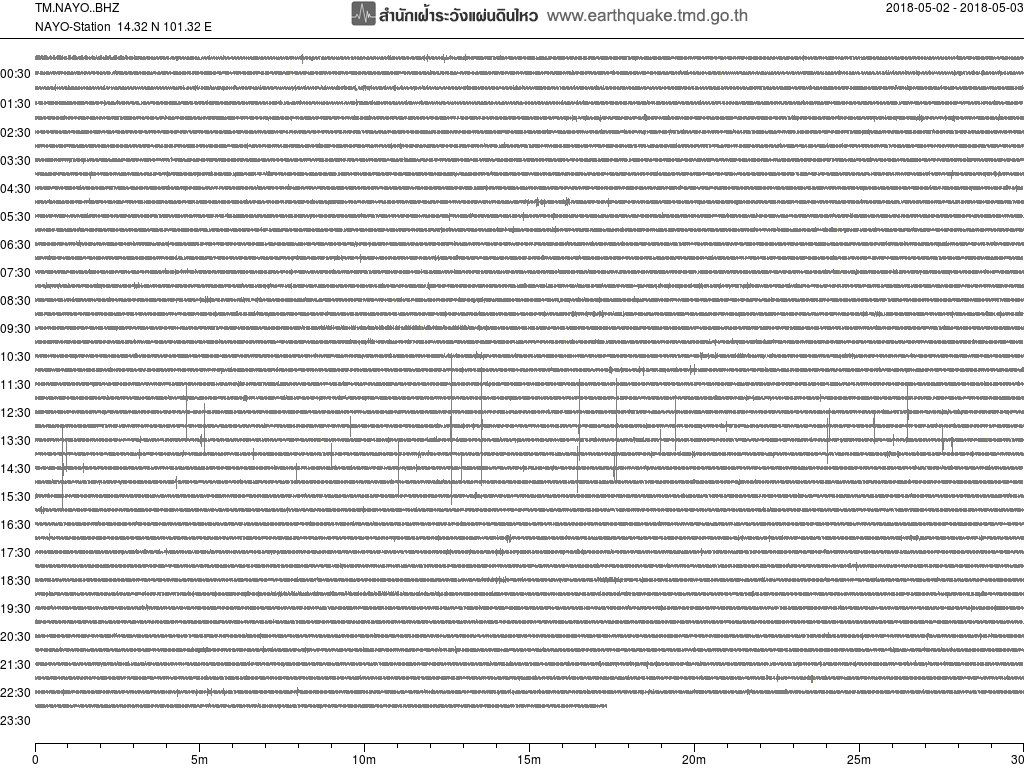 - กราฟแผ่นดินไหวจากสถานี นครนายก ของสำนักเฝ้าระวังฯ กรมอุตุฯ จากเวลา 07:00 เมื่อวานนี้ถึง 07:00 เช้านี้