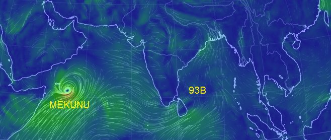 - 10:00 หย่อมความกดอากาศต่ำ 93B ในอ่าวเบงกอลรบกวนทำให้ลมมรสุมตะวันตกเฉียงใต้อ่อนแรงและเปลี่ยนทิศ ลักษณะเช่นนี้ทำให้การเข้าสู่ฤดูฝนของไทยเลื่อนช้าออกไปเรื่อยๆ ขณะเดียวกันพายุไซโคลน Mekunu (เมกูนู) ในทะเลอาหรับก็ทวีกำลังขึ้นเรื่อยๆทิศทางมุ่งไปทางประเทศโอมาน