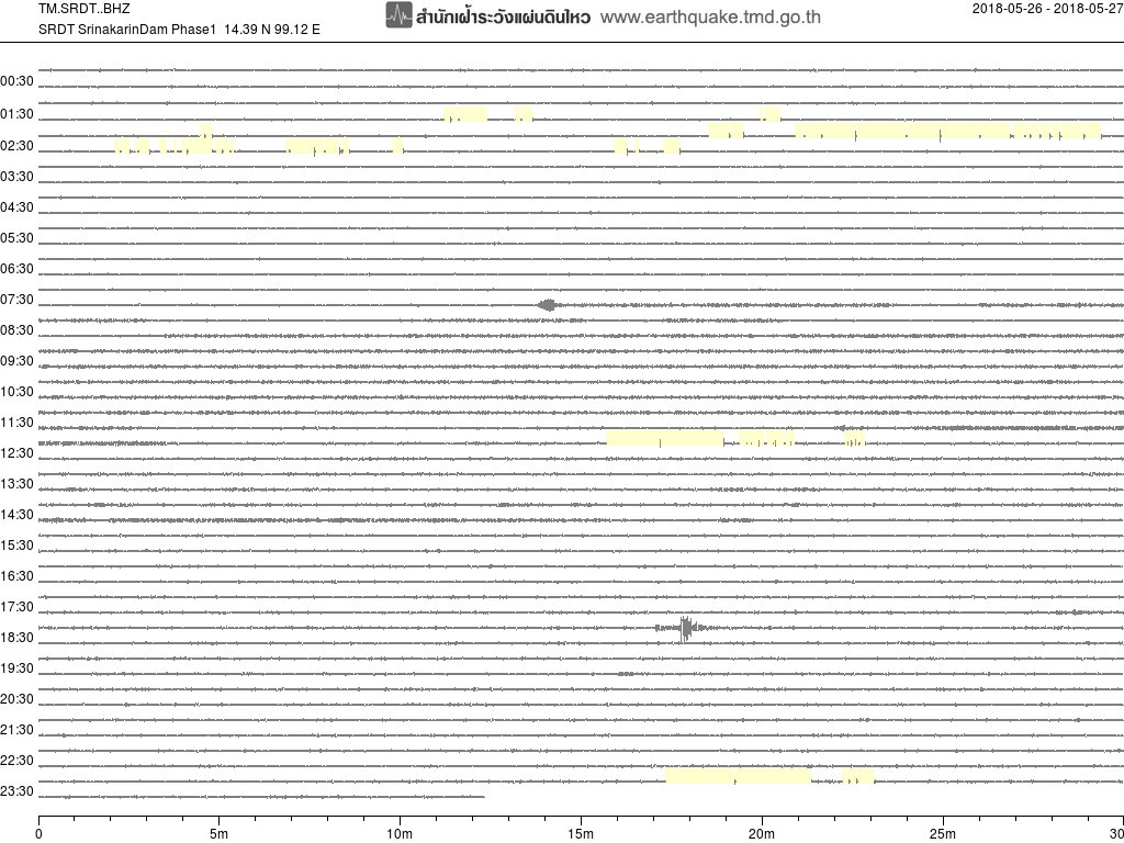 - กราฟแผ่นดินไหวจากสถานี SRDT เขื่อนศรีนครินทร์ ของสำนักเฝ้าระวังฯ กรมอุตุฯ จากเวลา 07:00 เมื่อวานนี้ถึง 07:00 เช้านี้