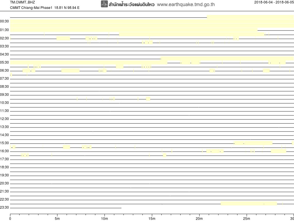 • กราฟแผ่นดินไหวจากสถานี CMMT จ.เชียงใหม่ของสำนักเฝ้าระวังฯ กรมอุตุฯ จากเวลา 07:00 เมื่อวานนี้ถึง 07:00 เช้านี้