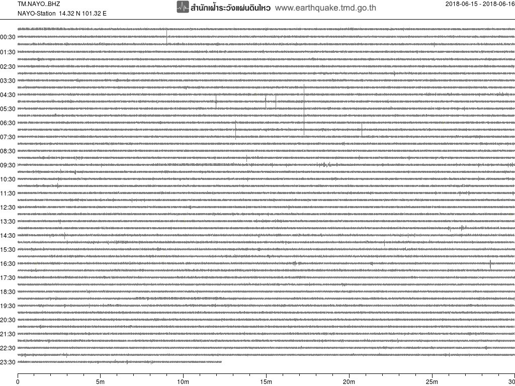 - กราฟแผ่นดินไหวจากสถานี นครนายก ของสำนักเฝ้าระวังฯ กรมอุตุฯ จากเวลา 07:00 เมื่อวานนี้ถึง 07:00 เช้านี้