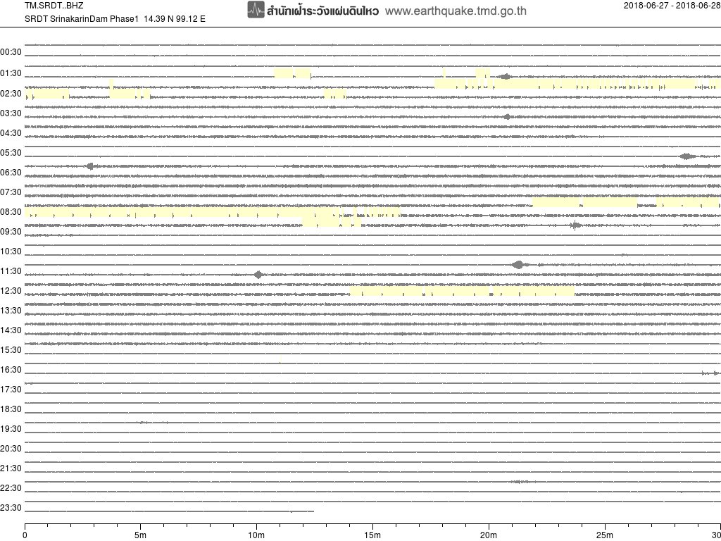 - กราฟแผ่นดินไหวจากสถานี SRDT เขื่อนศรีนครินทร์ ของสำนักเฝ้าระวังฯ กรมอุตุฯ จากเวลา 07:00 เมื่อวานนี้ถึง 07:00 เช้านี้
