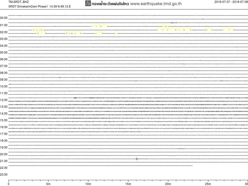 - กราฟแผ่นดินไหวจากสถานี SRDT เขื่อนศรีนครินทร์ ของสำนักเฝ้าระวังฯ กรมอุตุฯ จากเวลา 07:00 เมื่อวานนี้ถึง 07:00 เช้านี้