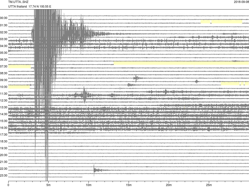 - กราฟแผ่นดินไหวจากสถานี UTTA เขื่อนสิริกิติ์ จ.อุตรดิตถ์ ของสำนักเฝ้าระวังฯ กรมอุตุฯ จากเวลา 07:00 เมื่อวานนี้ถึง 07:00 เช้านี้