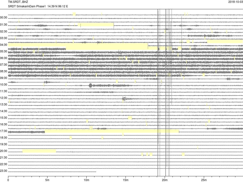 - กราฟแผ่นดินไหวจากสถานี SRDT เขื่อนศรีนครินทร์ ของสำนักเฝ้าระวังฯ กรมอุตุฯ จากเวลา 07:00 เมื่อวานนี้ถึง 07:00 เช้านี้