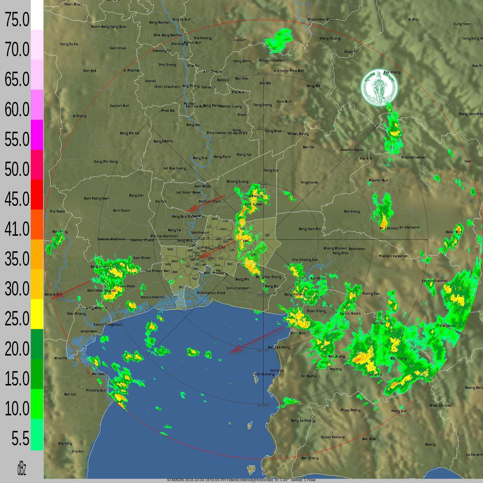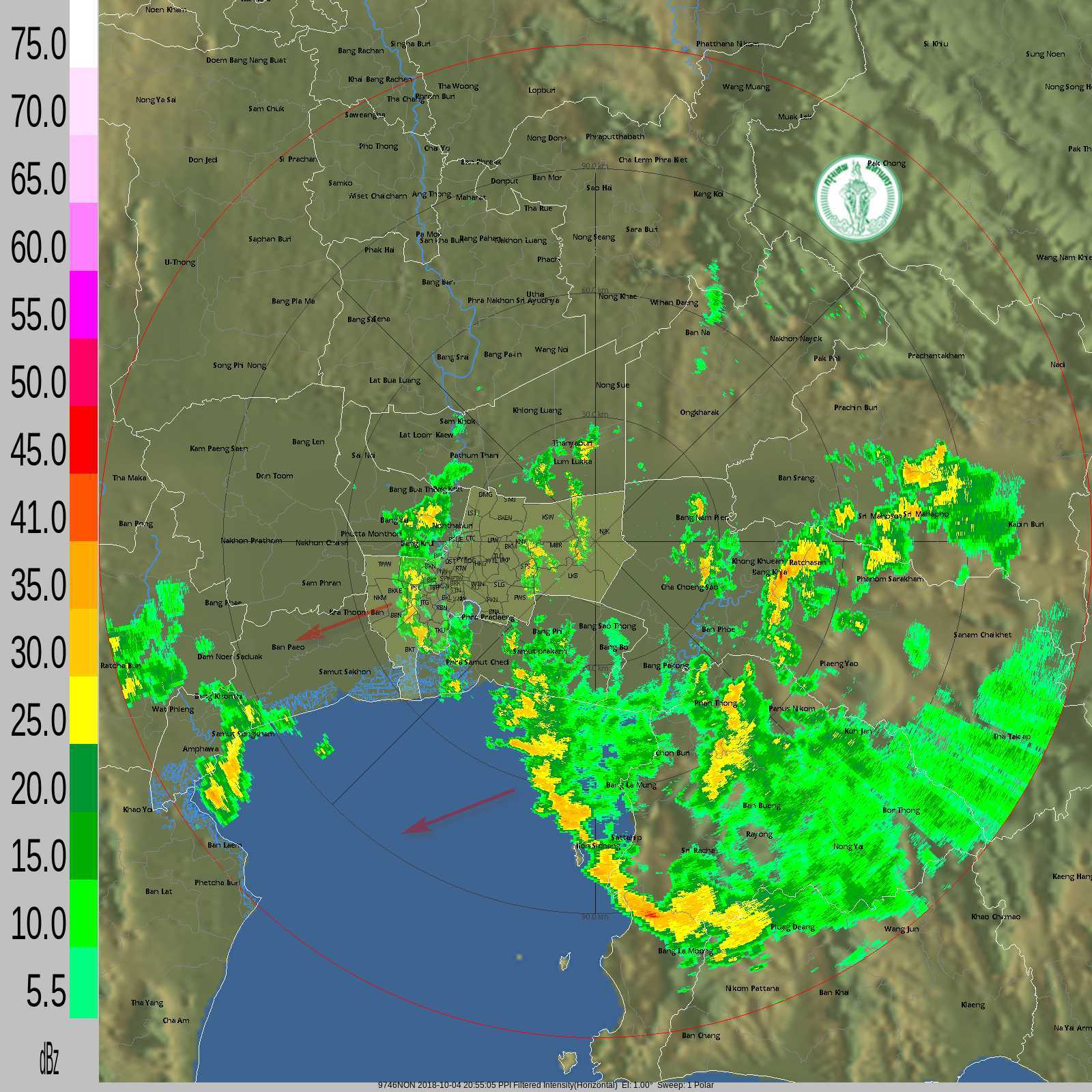 - 19:00 กทม.มีฝนเล็กน้อย เขตบางแค ภาษีเจริญ จอมทอง ธนบุรี คลองสาน บางกอกใหญ่ หนองจอก / ด้านนอกฝนเล็กน้อยถึงปานกลางกระทุ่มแบน สามพราน ฉะเชิงเทราเคลื่อนตัวทิศตะวันตกเฉียงใต้ ดูภาพเรดาร์
