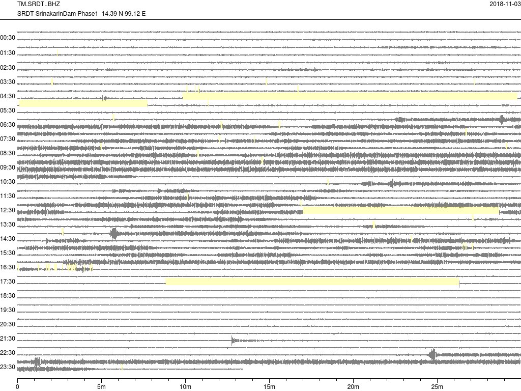 - กราฟแผ่นดินไหวจากสถานี SRDT เขื่อนศรีนครินทร์ ของสำนักเฝ้าระวังฯ กรมอุตุฯ จากเวลา 07:00 เมื่อวานนี้ถึง 07:00 เช้านี้