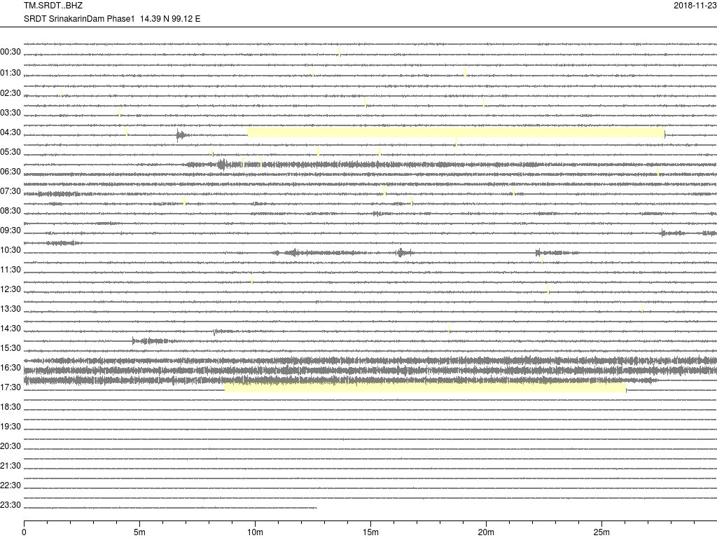 - กราฟแผ่นดินไหวจากสถานี SRDT เขื่อนศรีนครินทร์ ของสำนักเฝ้าระวังฯ กรมอุตุฯ จากเวลา 07:00 เมื่อวานนี้ถึง 07:00 เช้านี้