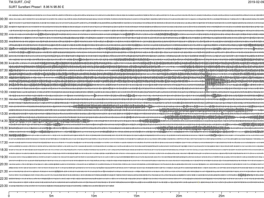 - กราฟแผ่นดินไหวจากสถานี จ.สุราษฎ์ธานี (SURTของสำนักเฝ้าระวังฯ กรมอุตุฯ จากเวลา 07:00 เมื่อวานนี้ถึง 07:00 เช้านี้