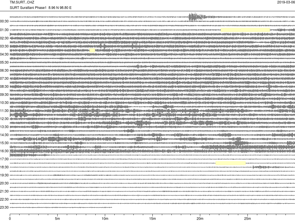 - กราฟแผ่นดินไหวจากสถานี จ.สุราษฎร์ธานี (SURT) ของสำนักเฝ้าระวังฯ กรมอุตุฯ จากเวลา 07:00 เมื่อวานนี้ถึง 07:00 เช้านี้