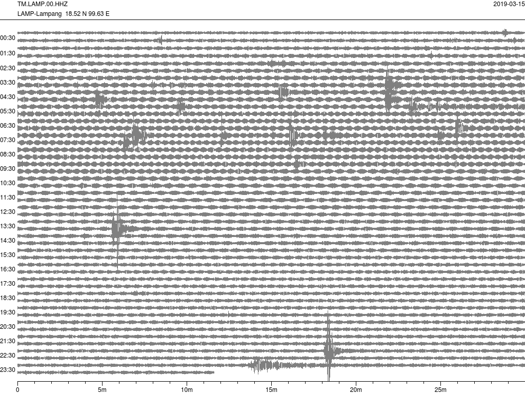 - กราฟแผ่นดินไหวจากสถานีเขื่อนกิ่วลม จ.ลำปาง (LAMP)ของสำนักเฝ้าระวังฯ กรมอุตุฯ จากเวลา 07:00 เมื่อวานนี้ถึง 07:00 เช้านี้
