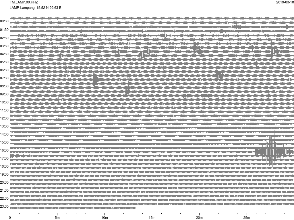 - กราฟแผ่นดินไหวจากสถานีเขื่อนกิ่วลม จ.ลำปาง (LAMP) ของสำนักเฝ้าระวังฯ กรมอุตุฯ จากเวลา 07:00 เมื่อวานนี้ถึง 07:00 เช้านี้