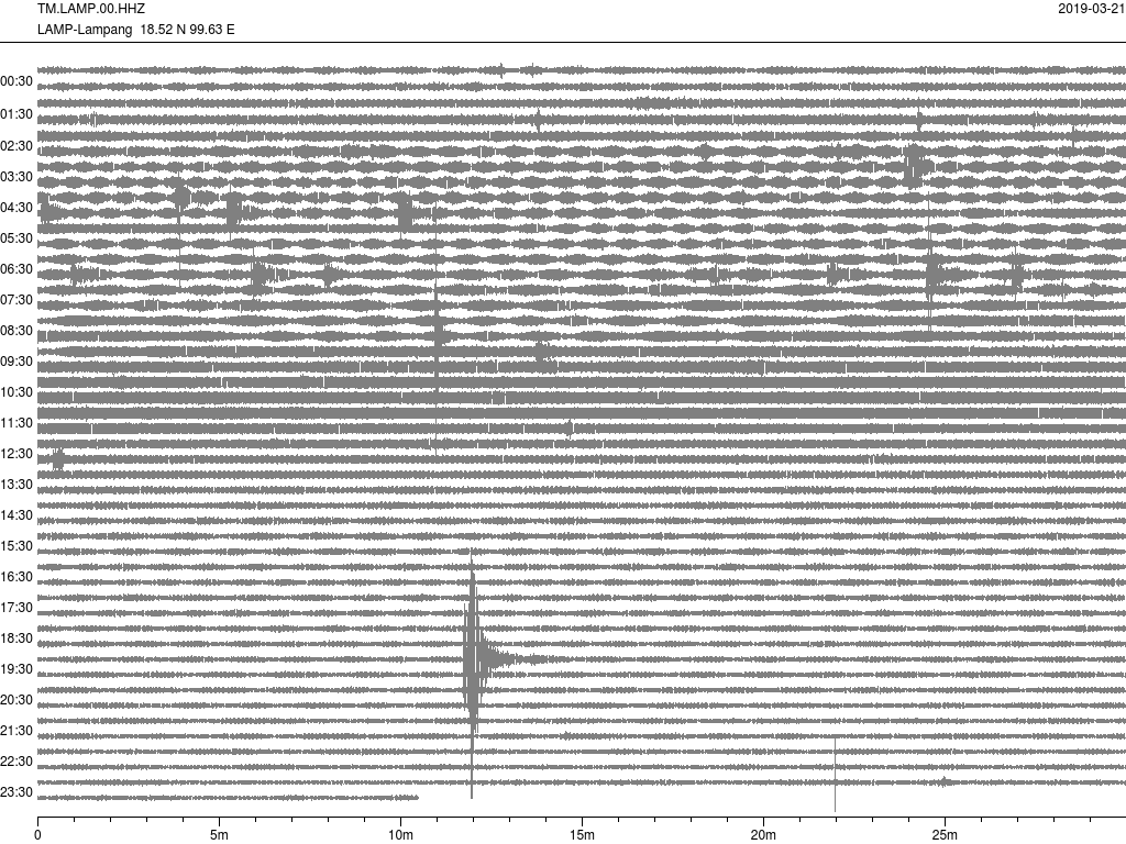 - กราฟแผ่นดินไหวจากสถานีเขื่อนกิ่วลม จ.ลำปาง (LAMP) ของสำนักเฝ้าระวังฯ กรมอุตุฯ จากเวลา 07:00 เมื่อวานนี้ถึง 07:00 เช้านี้