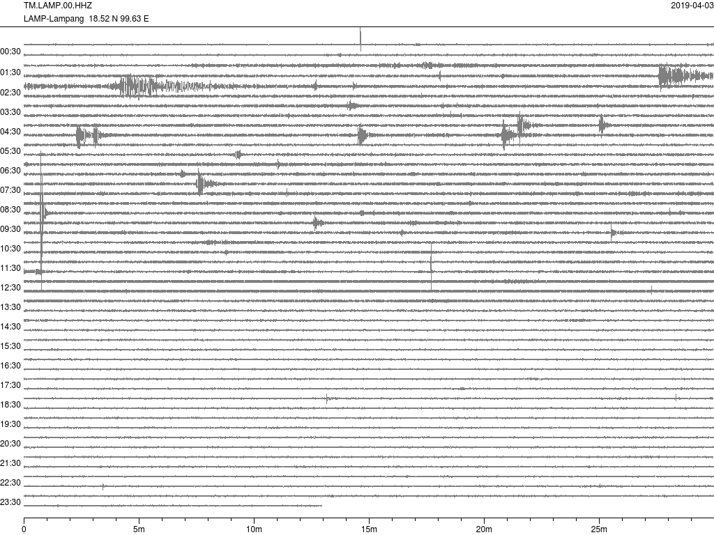 - กราฟแผ่นดินไหวจากสถานีเขื่อนกิ่วลม จ.ลำปาง (LAMP) ของสำนักเฝ้าระวังฯ กรมอุตุฯ จากเวลา 07:00 เมื่อวานนี้ถึง 07:00 เช้านี้