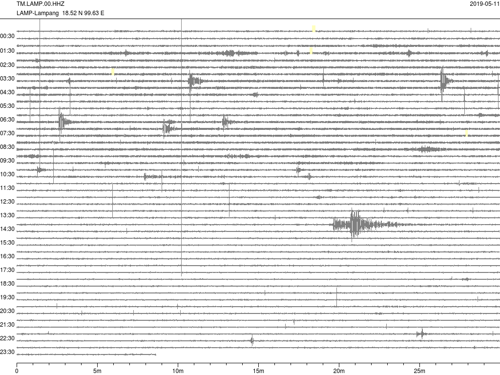 - กราฟแผ่นดินไหวจากสถานีเขื่อนกิ่วลม จ.ลำปาง (LAMP) ของสำนักเฝ้าระวังฯ กรมอุตุฯ จากเวลา 07:00 เมื่อวานนี้ถึง 07:00 เช้านี้
